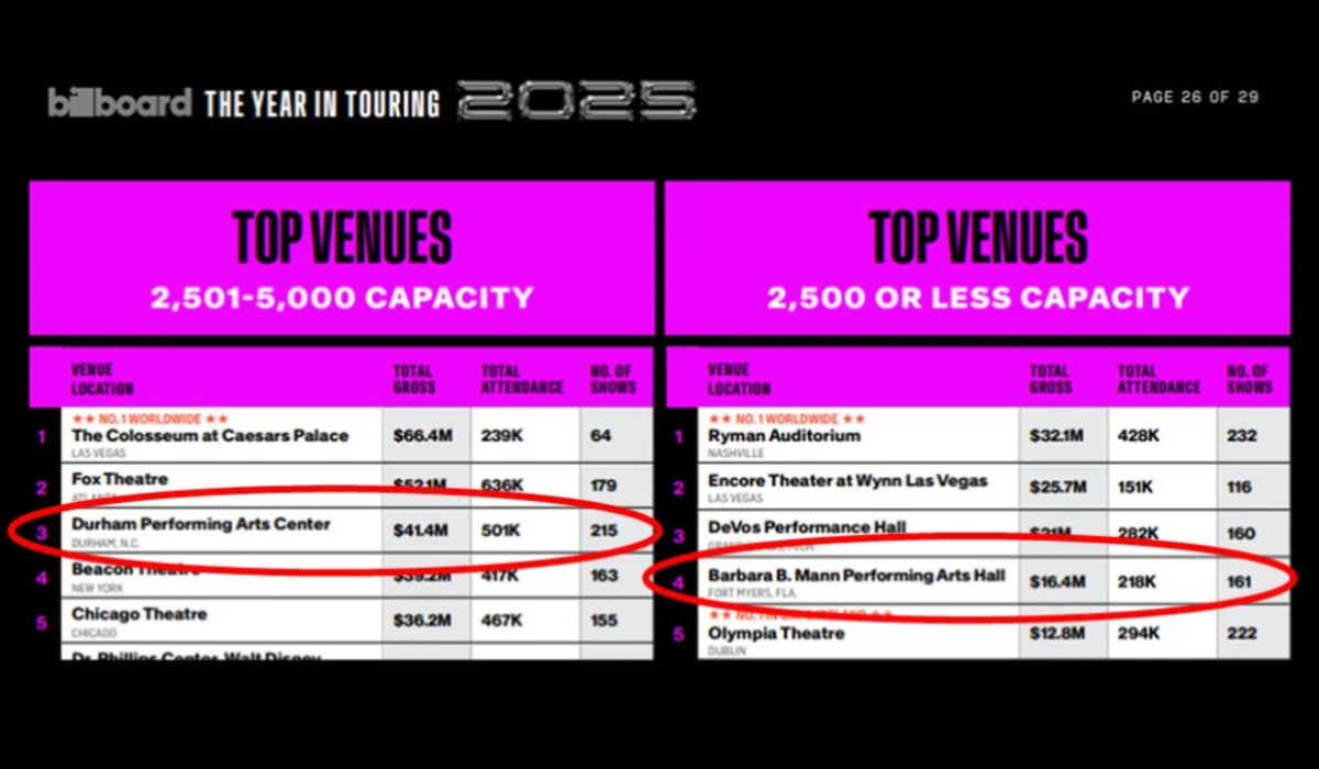 Billboard announces the Billboard Boxscore 2025 Full Year Rankings. In the category for venues with capacities of 2,501-5,000, PFM's Durham Performing Arts Center finishes #3 in the World. In the category for venues with capacities of 2,500 or less, PFM's Barbara B. Mann Performing Arts Hall finishes #4 in the World.
